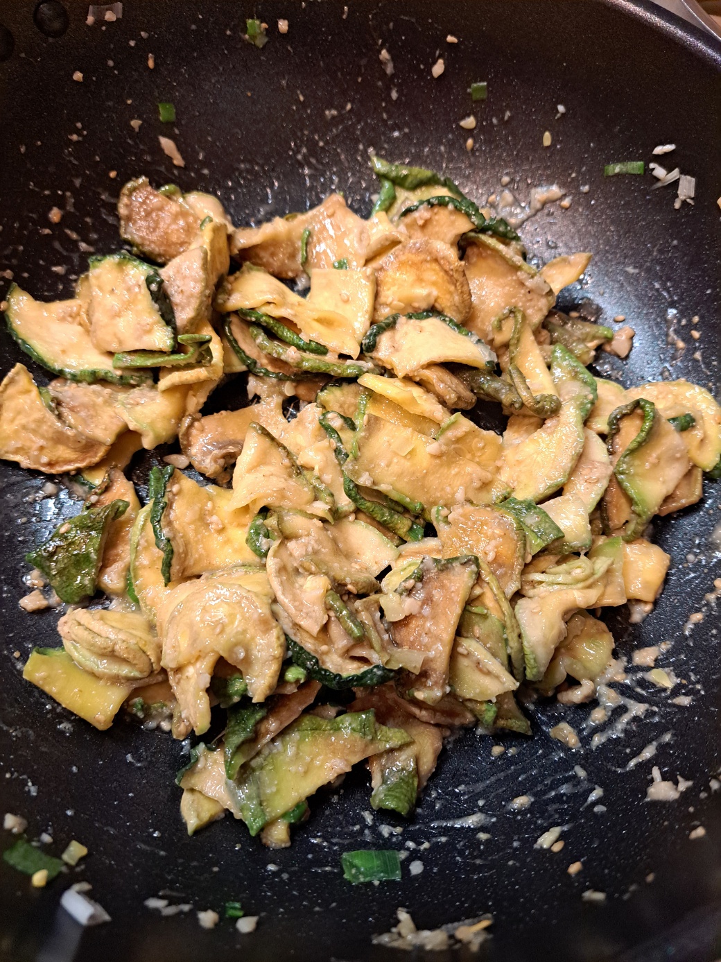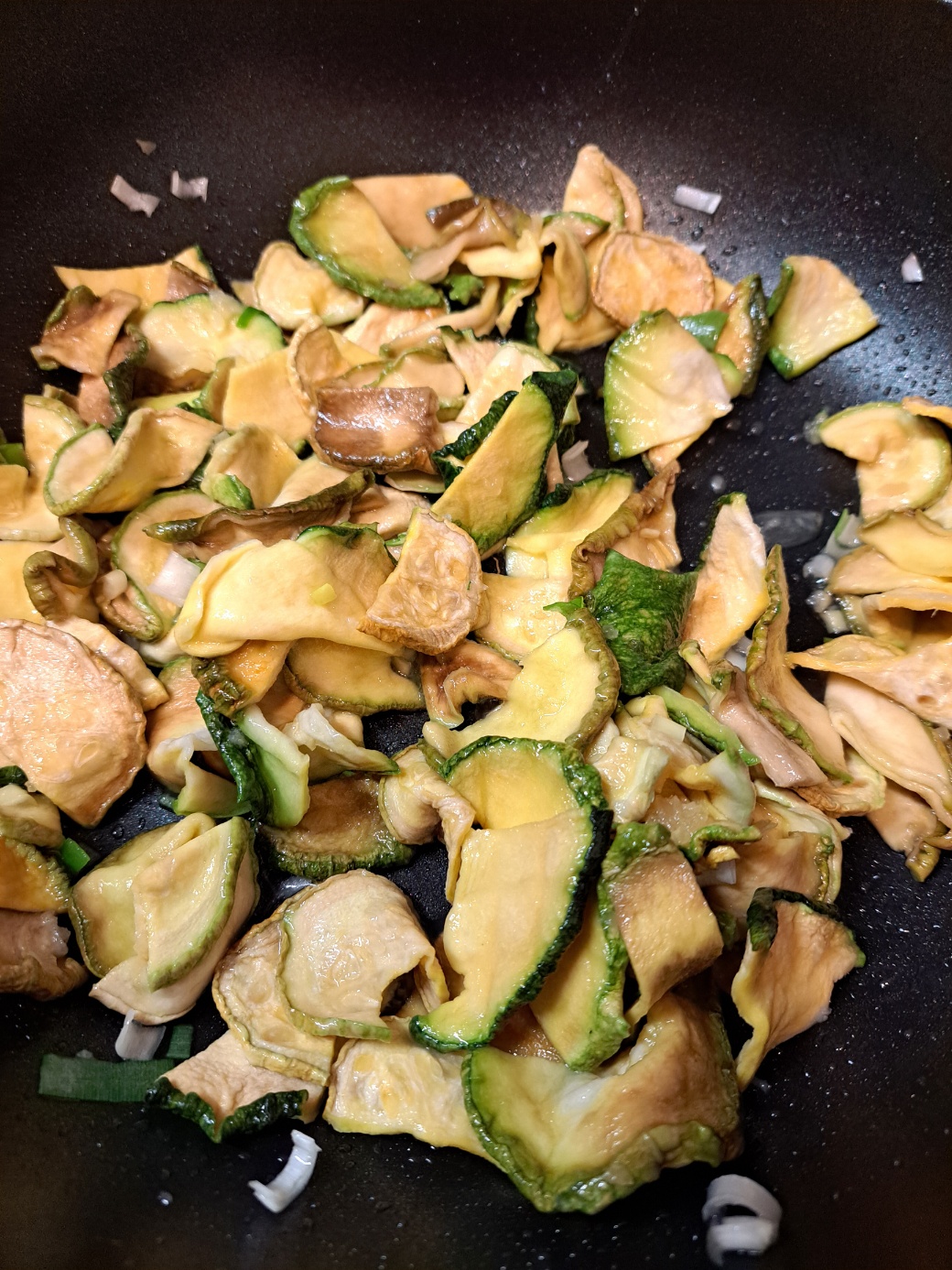 기름을 두른 팬에 호박고지를 넣고, 다진 파와 마늘을 넣어 볶았어요.