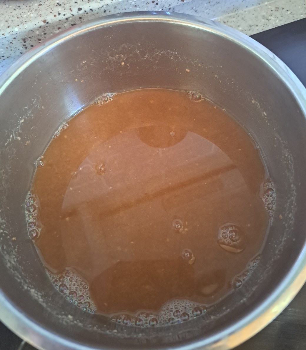 그리고, 준비해 둔 된장 육수를 부었어요. 다 붓지 마시고, 어느 정도 붓고 모자라면 더 붓는 식으로 해야 찹찹한 강된장을 만드는 데 실패가 없겠죠?