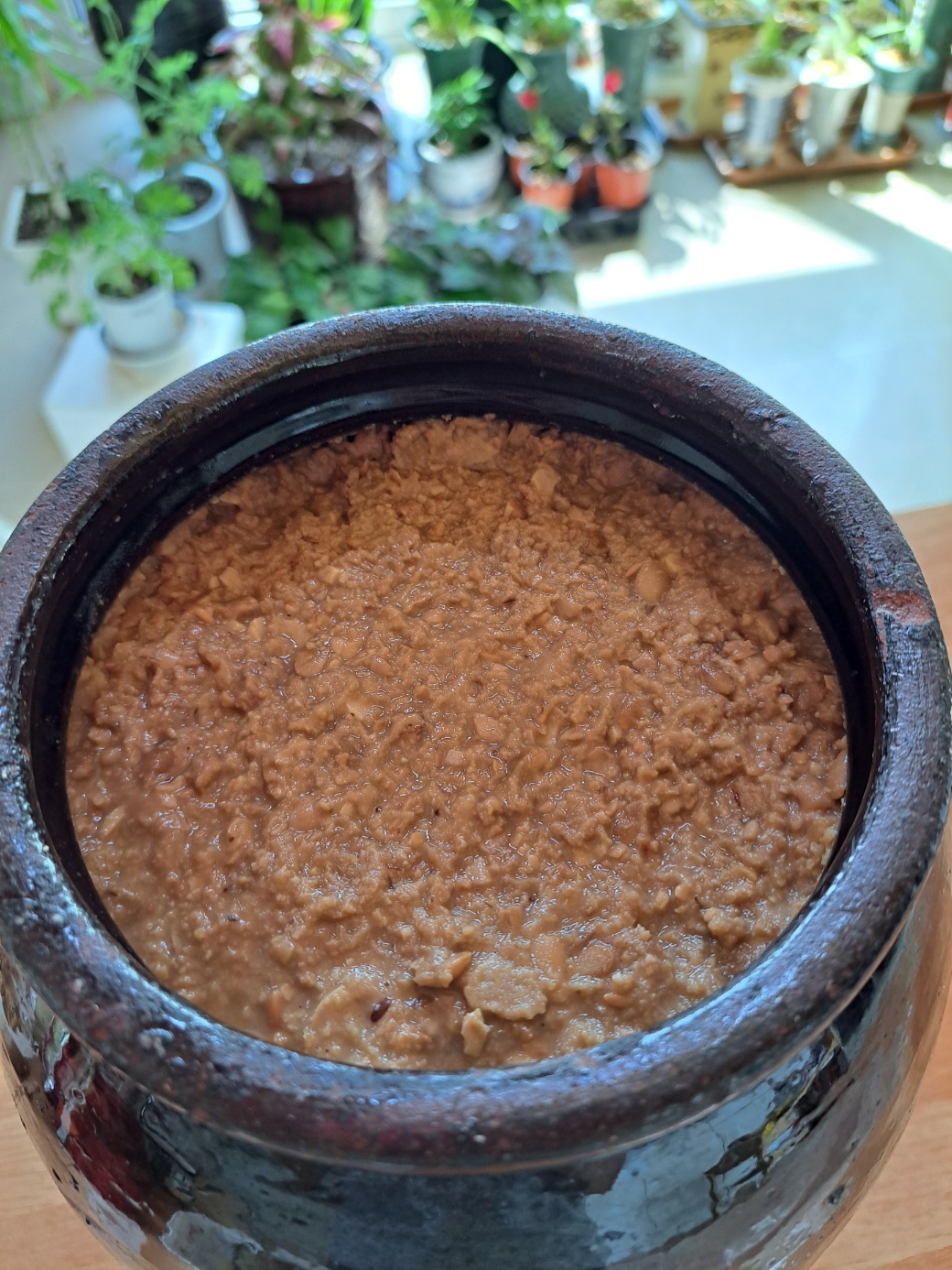 이렇게 페이스트(콩건더기는 많지만) 상태가 되었으면, 미리 스팀 소독해 둔 옹기 항아리(장독이라 하긴 너무 거창하지요)에 꼭꼭 담아줍니다.