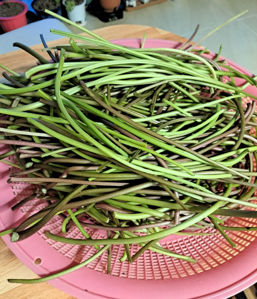 잘라온 고구마줄기는 하나씩 떼어내서, 나물이 될 줄기 부분만 골라서 집으로 가져왔어요.