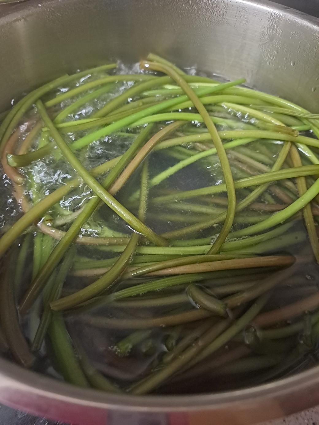고구마 줄기를 물에 잠기게 하고, 잠시 후 물이 다시 끓어오를 때 건져요. (물과 고구마줄기의 양에 따라, 시간을 재기 보다는 이렇게 하는 게 더 좋은 것 같아요.)