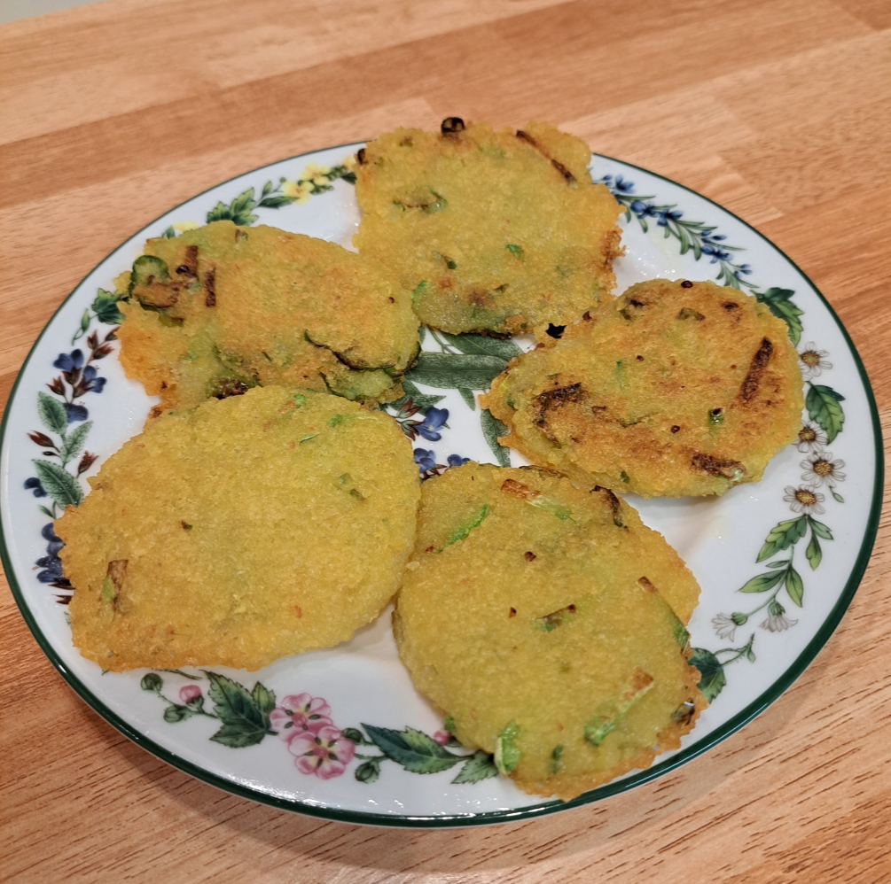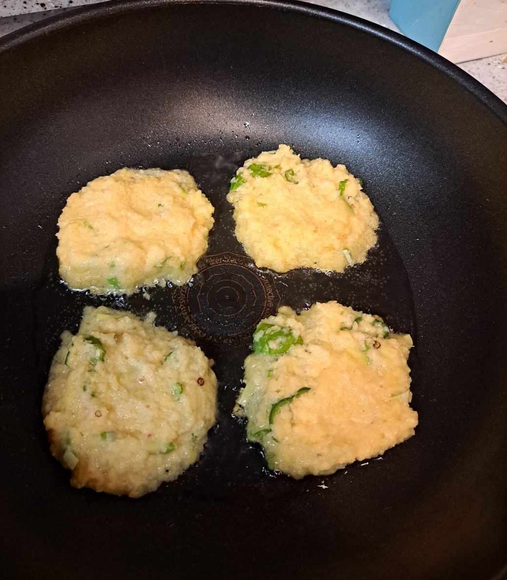 이것을 숟가락으로 떠서 기름 두른 후라이팬에 올리고 중불에서 살살 부쳐요.