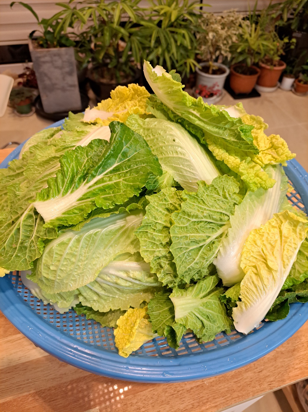 금년에는 배추가 자라지를 못했네요. 완전무농약을 자부하는 우리집 배추인데, 김장철이 된 지금까지도 기껏해야 알배추 수준이네요. 비록 봄동만큼밖에 못자랐어도 하이디는 기쁘게 요리해 먹습니다!