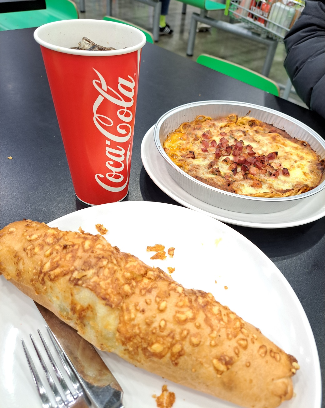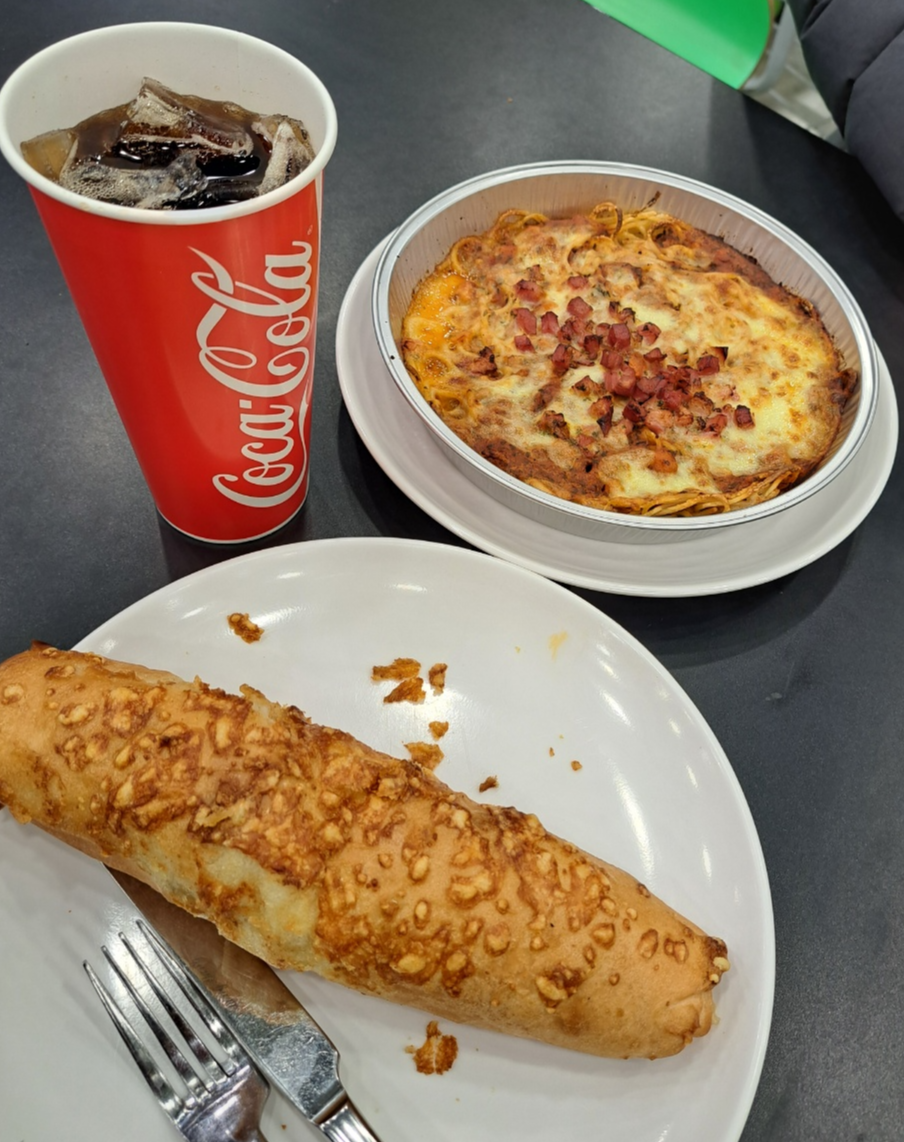 우리가 선택한 건, 치즈오븐 스파게티하고 미트 베이크, 그리고 콜라였어요.