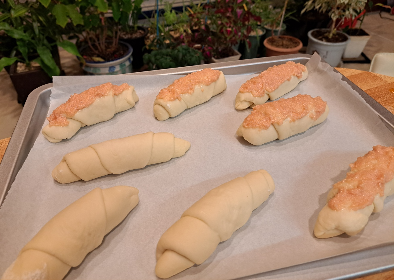 이렇게 명란마요를 올린 채로 2차 발효를 수행했어요. 30-40도의 온도에서 1시간 정도 발효시켰더니, 이스트 발효의 힘이 명란마요까지 들어올렸네요. 어떤 것은 명란 덮은 것이 옆으로 비뚤어지기도 했지만, 빵맛에는 지장이 없을 거에요. ㅎㅎ