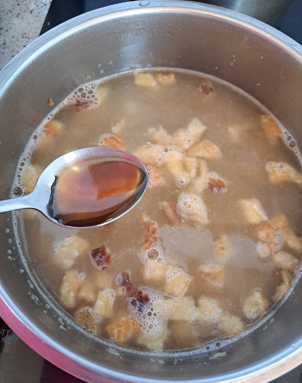 국물의 양에 따라 국간장의 양이 달라질텐데요, 처음에는 두 숟가락 정도만 넣고, 물을 부은 다음에 간을 보면 되겠어요.