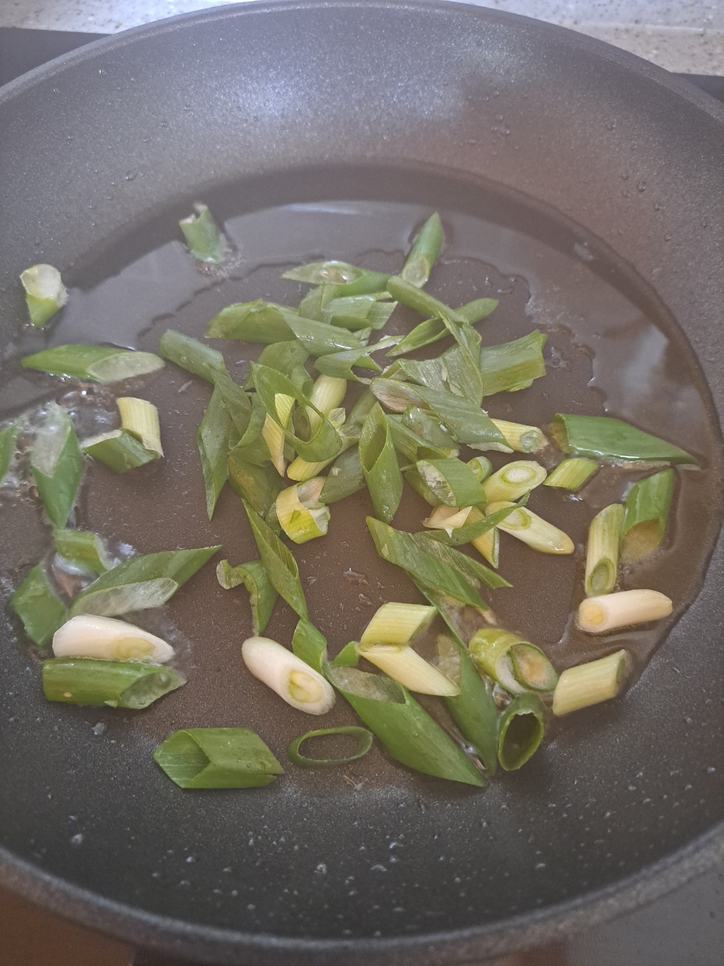 팬에 기름을 데워서 파를 먼저 볶아 파기름을 내줍니다.